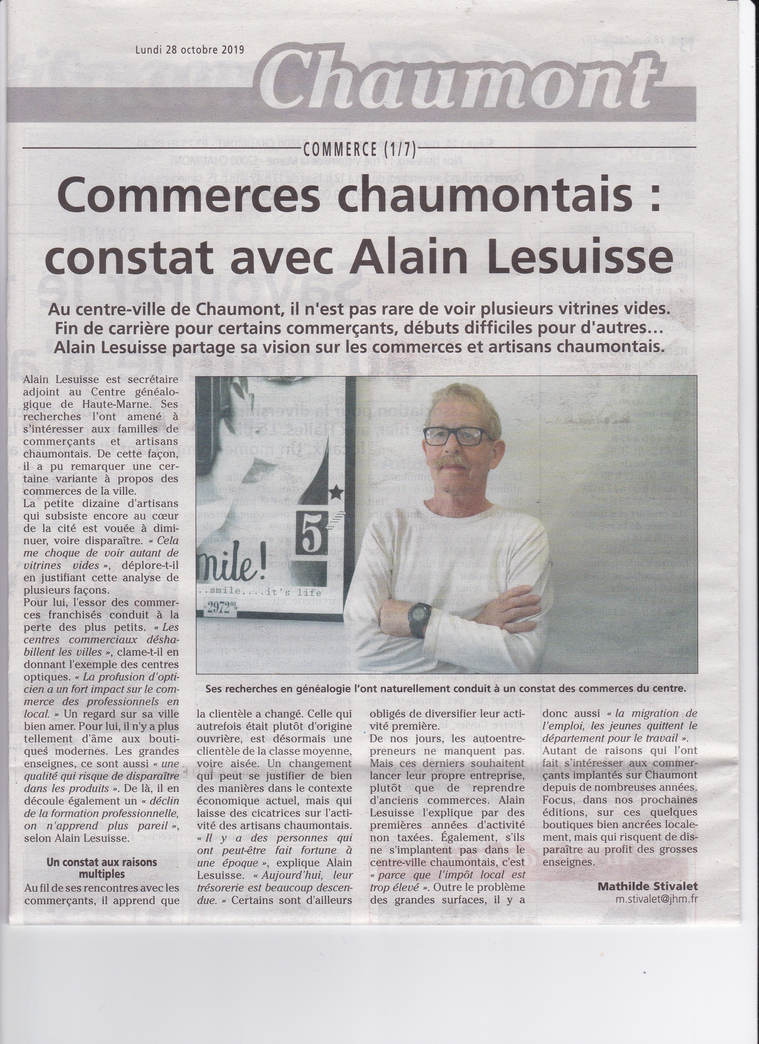 Publié dans Le Journal de la Haute-Marne du 28/10/2019 au sujet de l'étude historique des commerçants chaumontais par Alain Lesuisse. Cette étude fera certainement l'objet d'articles dans notre revue, ce dont nous remercions grandement Alain.